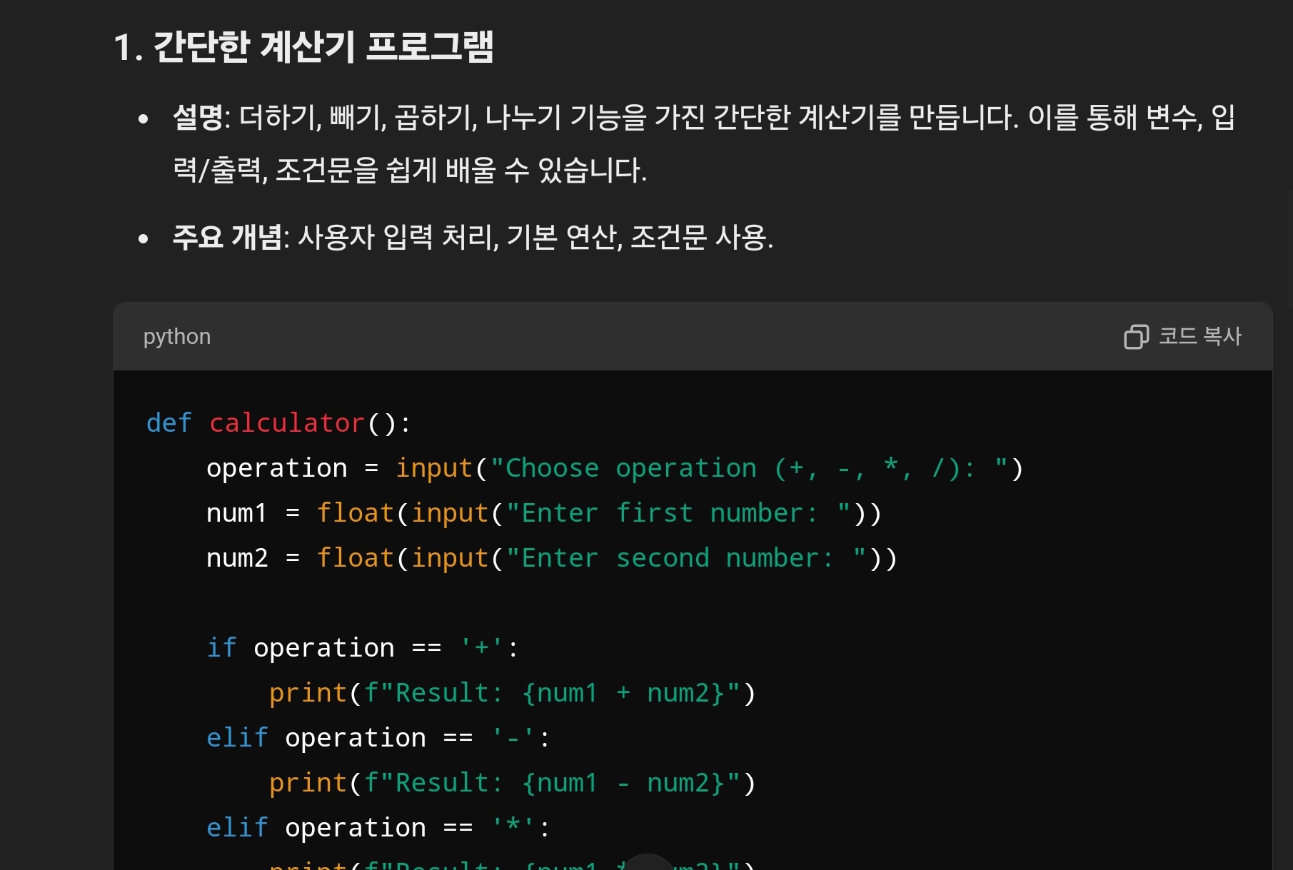 Python 설치와 VS code 설치까지 완료되었다면 테스트로 간단한 예제 프로그램을 실행해보겠습니다. 더하기, 뺴기, 곱하기, 나누기를 할 수 있는 코드이고 실행을 하면 어떤 연산을 할지를 정하고, 첫번쨰 숫자, 두번째 숫자를 순서대로 입력하면 계산 결과가 출력으로 나오게 됩니다.